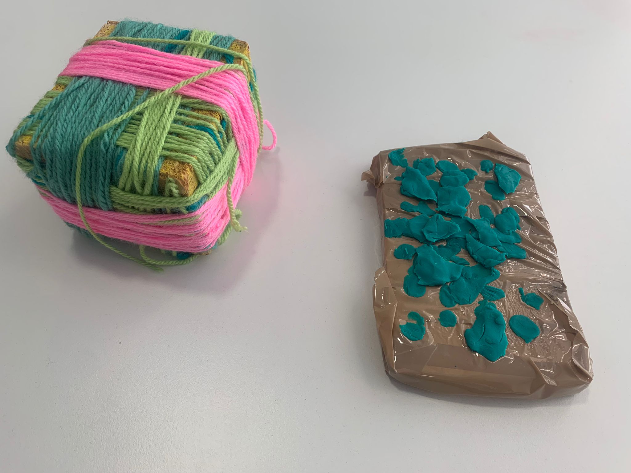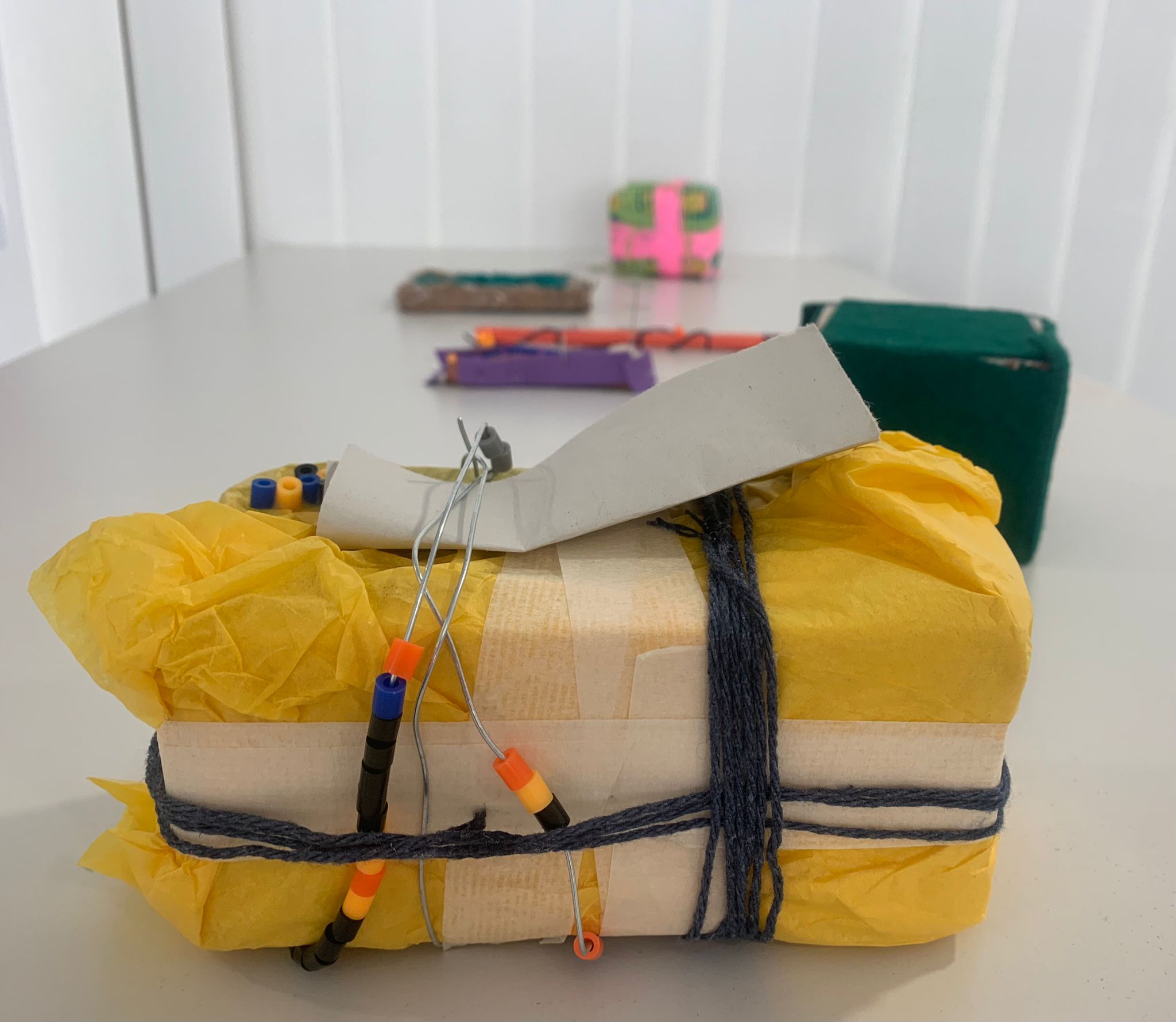 La expresión de rodear las cajas con cuerdas finas y textil, el recurso de lo pequeño en comparación con lo voluminoso, con materiales básicos, lo interpretable responde a una manifestación subjetiva del autor.