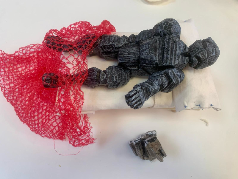 Ángel ha trabajado tanto en el taller como en casa. Nos cuenta sobre su obra que le representa a él mismo en la cama, dónde pasa la mayor parte del tiempo, donde se siente encerrado y le cuesta bastante salir, por eso el muñeco es de piedra. La manta que lo cubre es una red en la que se siente atrapado. En este escenario que ha creado está también su perro, una de sus mayores ayudas: el que intenta sacarme siempre de la cama.