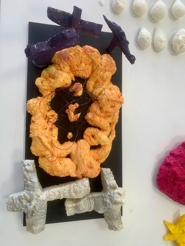 La pauta farmacológica (Asamblea local de Valencia, 2025) se enmarca como experiencia creativa para reflexionar e indagar en los procesos asociados a la toma de medicación, esto es, cómo me presento yo y mi entorno haciendo un uso positivo o negativo de la pauta farmacológica, cómo intercede en la visión del mundo y de mi mismo. Se han utilizado técnicas escultóricas mixtas con espuma de poliuretano y pinturas acrílicas.