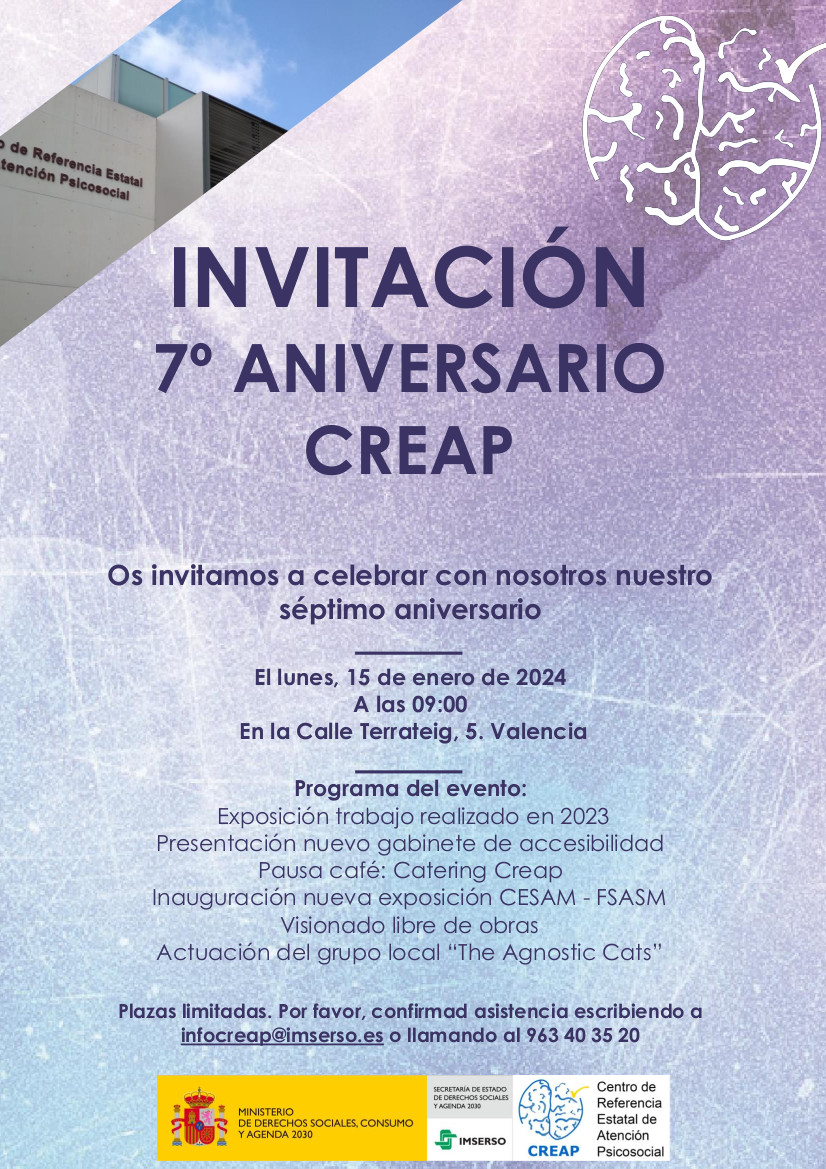El Centro de Referencia Estatal de Atención Psicosocial a personas con Trastorno Mental Grave (Creap), dependiente del Imserso, celebrará el próximo lunes 15 de enero de 2024 su séptimo aniversario del centro desde que éste recibiera a su primer usuario en enero de 2017 con una jornada de puertas abiertas dirigida principalmente a las personas usuarias, ex usuarias, colaboradores, familiares y trabajadores del centro.
